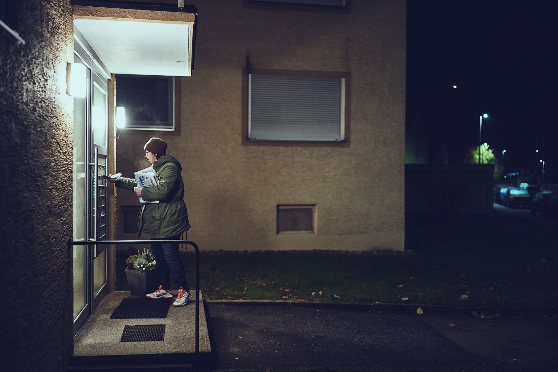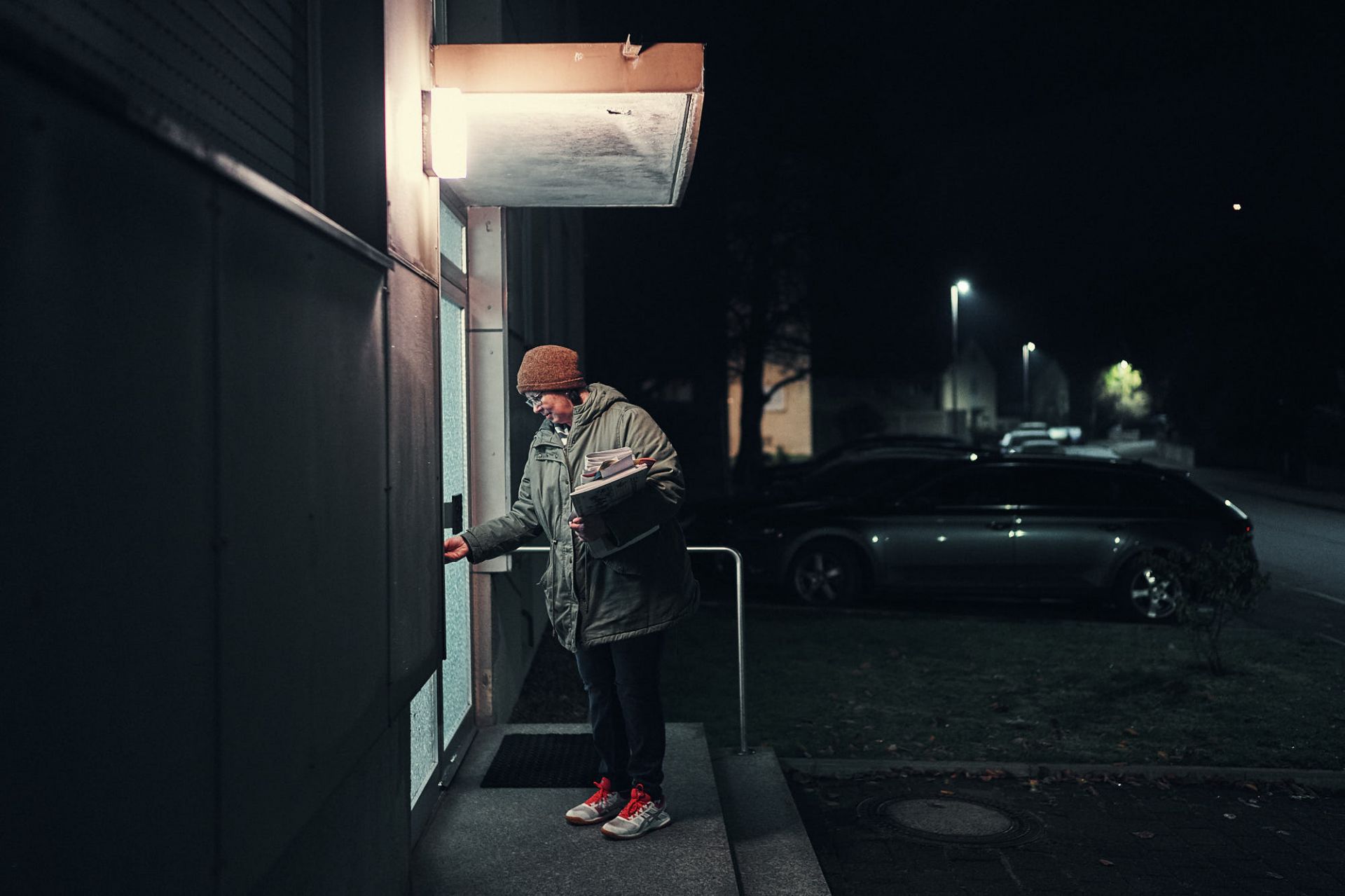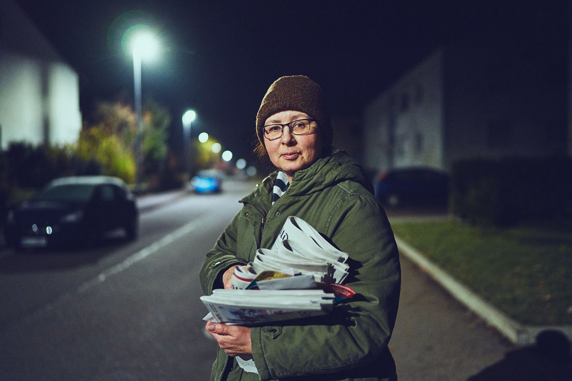 Sie packt Zeitungen, Pakete und Briefe in ihr Auto. Im ersten von zwei Bezirken parkt sie und sortiert unter dem Licht einer Straßenlaterne die Post. Anschließend startet die Verteilung. Abhängig von Witterung sowie Postaufkommen benötigt Silke zwischen zwei und zweieinhalb Stunden. Zuhause putzt sie sich schnell die Zähne. Mit der Vespertasche geht es wieder ins Auto. Die dreifache Mutter, deren Söhne schon alle erwachsen sind, arbeitet bei einem Hersteller für Leiterplatten in der Abteilung „Qualitätssicherung“. Jede zweite Woche ist sie in der Spätschicht eingeteilt und kommt erst gegen 23.30 Uhr nach Hause. Um 2.30 Uhr wieder aufzustehen, ist da beim besten Willen nicht drin: „Die Zeitungen verteile ich dann erst ab 4 Uhr.“ Silkes Wochentage beginnen somit entweder um 2.30 Uhr oder eine Stunde später. Dementsprechend ist gegen 20 Uhr „der Akku leer“, und sie geht schlafen.