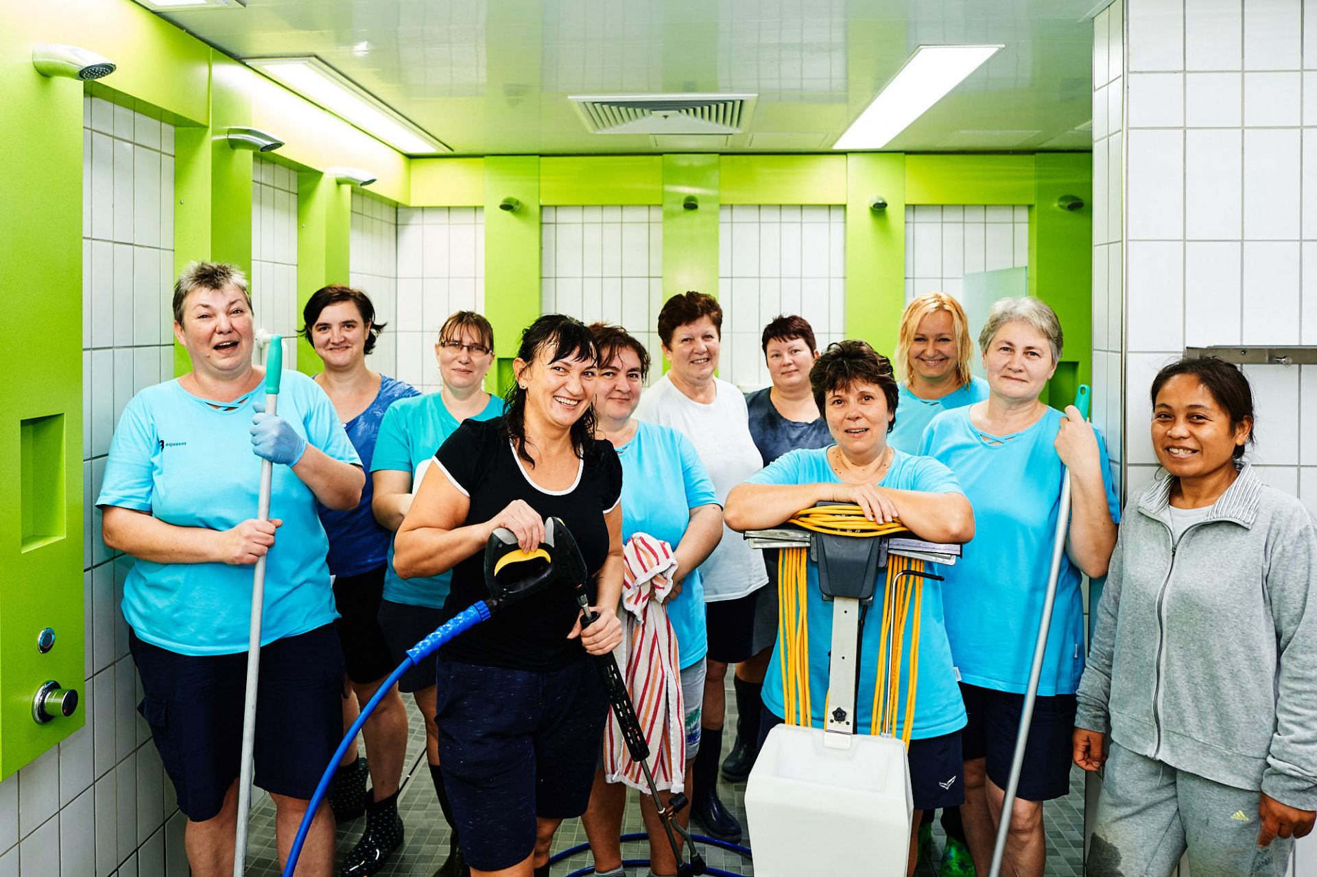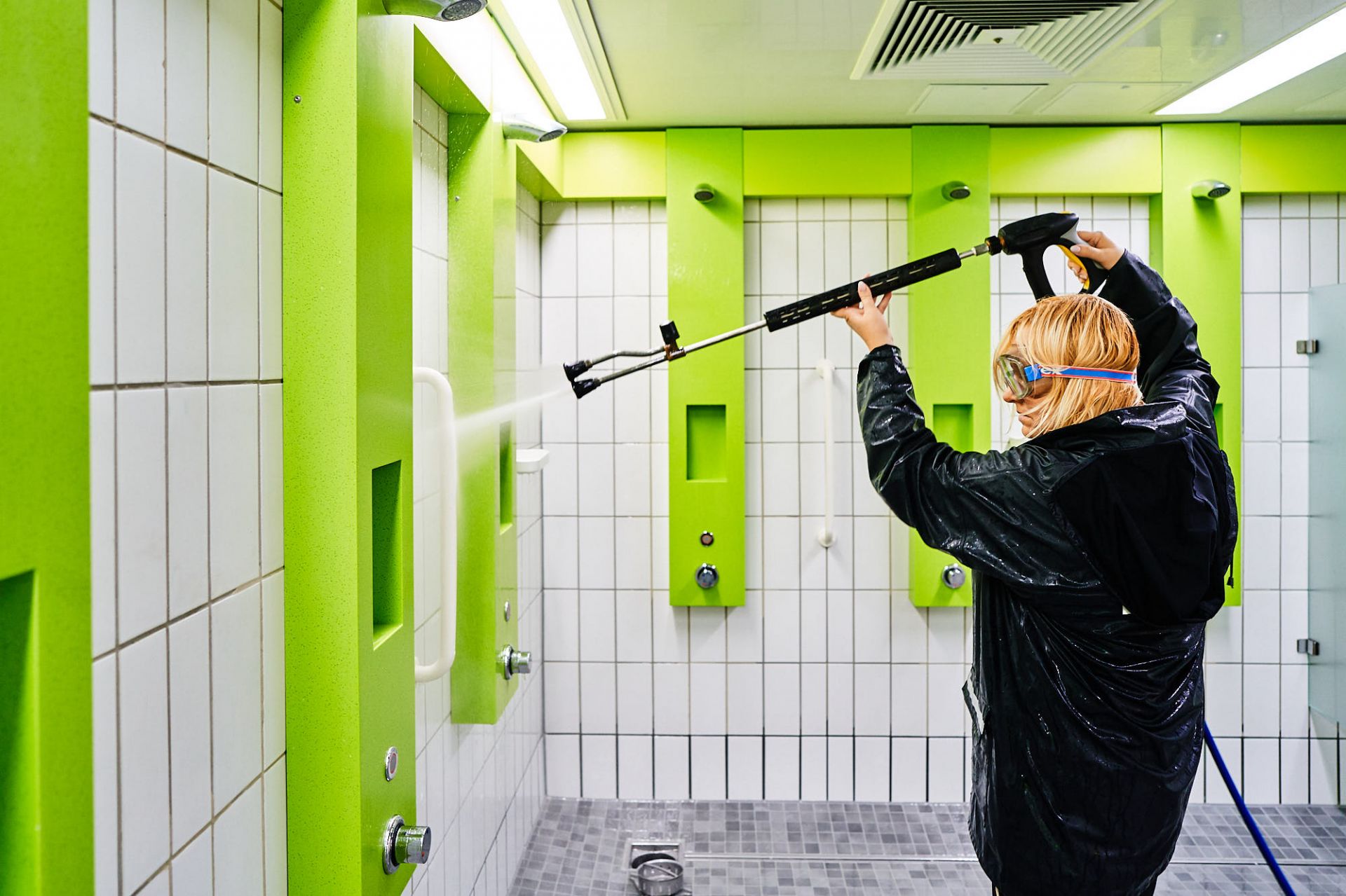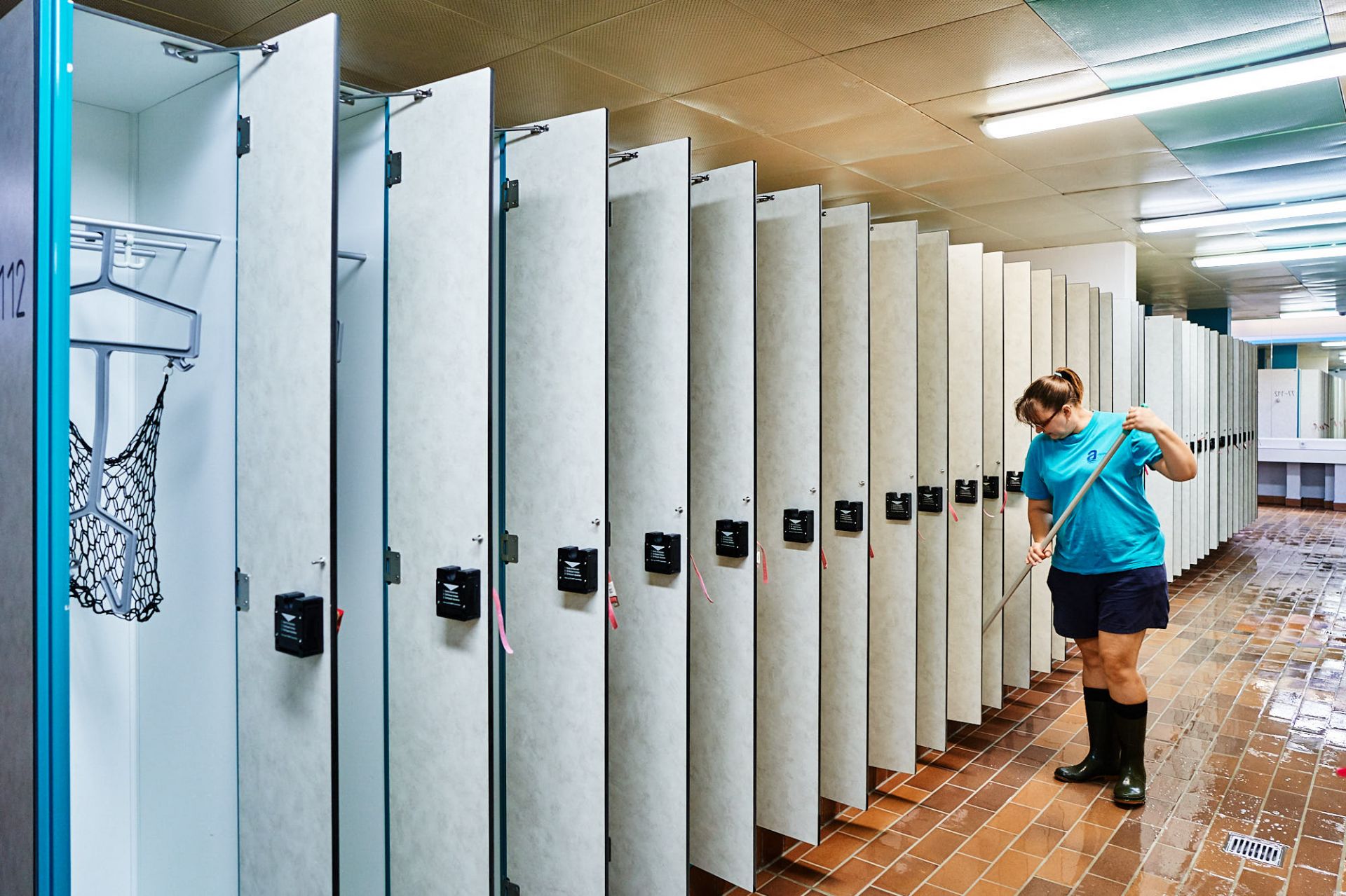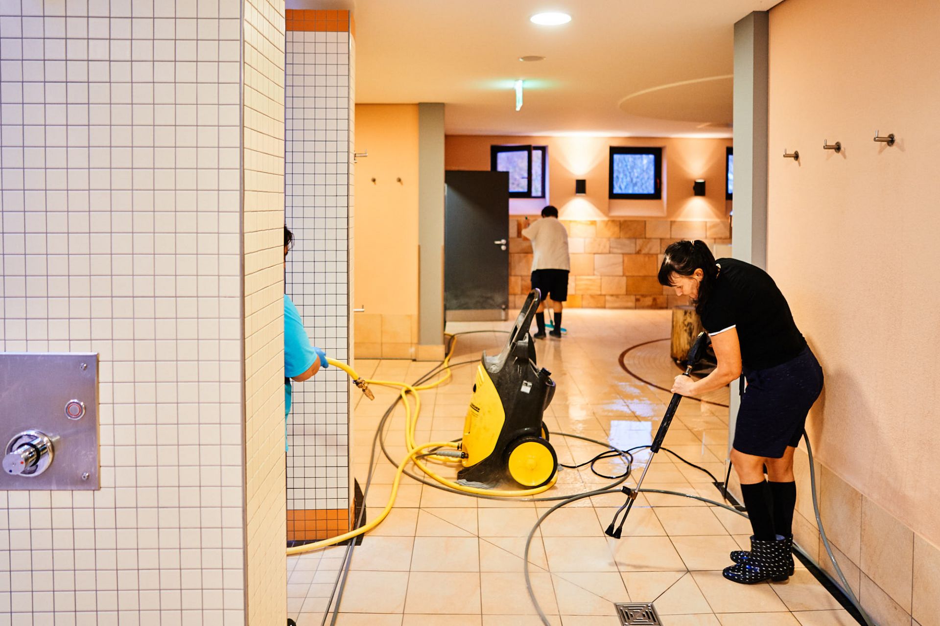Schutzkleidung, rutschfeste Stiefel und Schutzbrillen sind nötig, wenn Schaumkanone und Hochdruckreiniger in den Duschen oder der Sauna zum Einsatz kommen. Daneben heißt es WCs einwaschen, Bodenfließen vornässen, schrubben, abspritzen und trocken mobben, Glasscheiben einsprühen und abziehen, Müll sammeln, Toiletten desinfizieren, Staub saugen und Schränke auswischen.