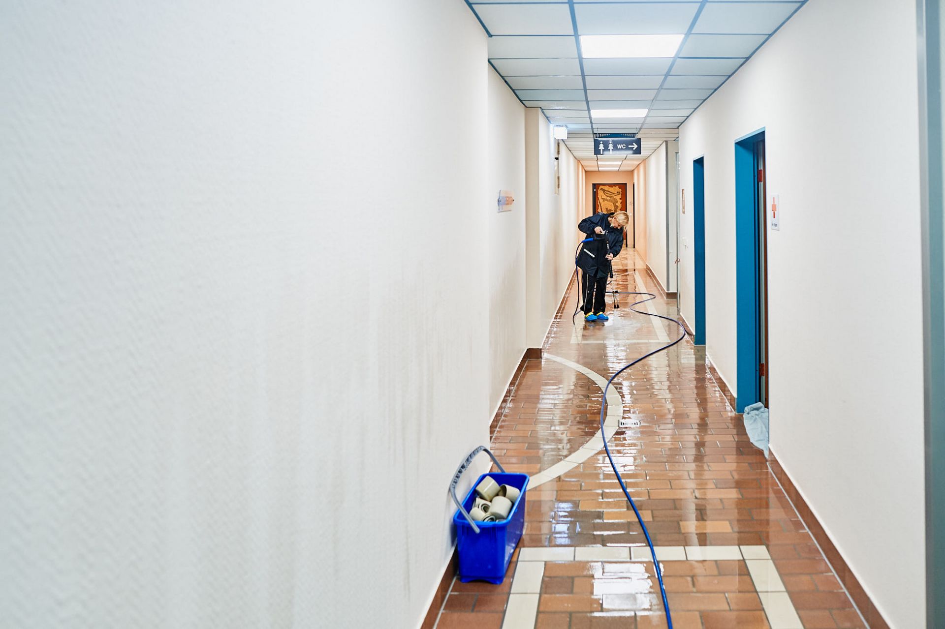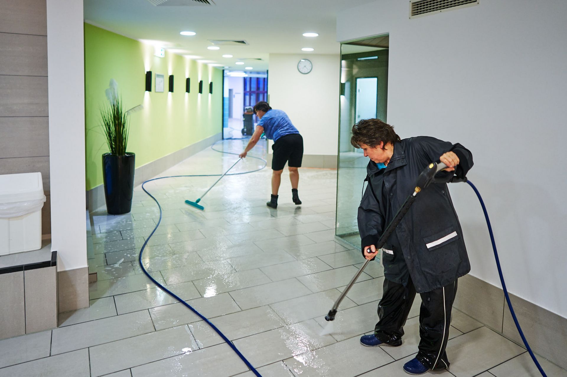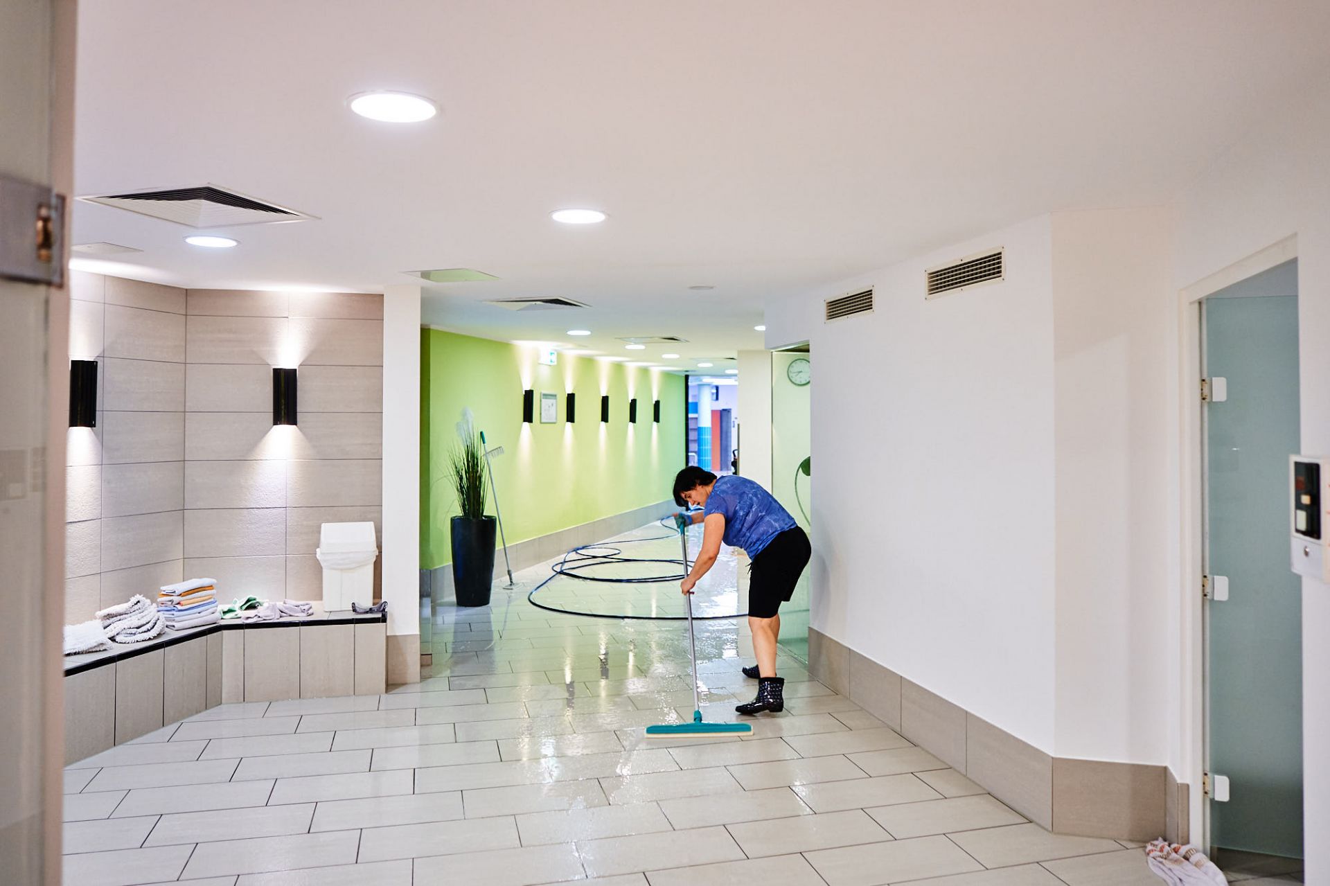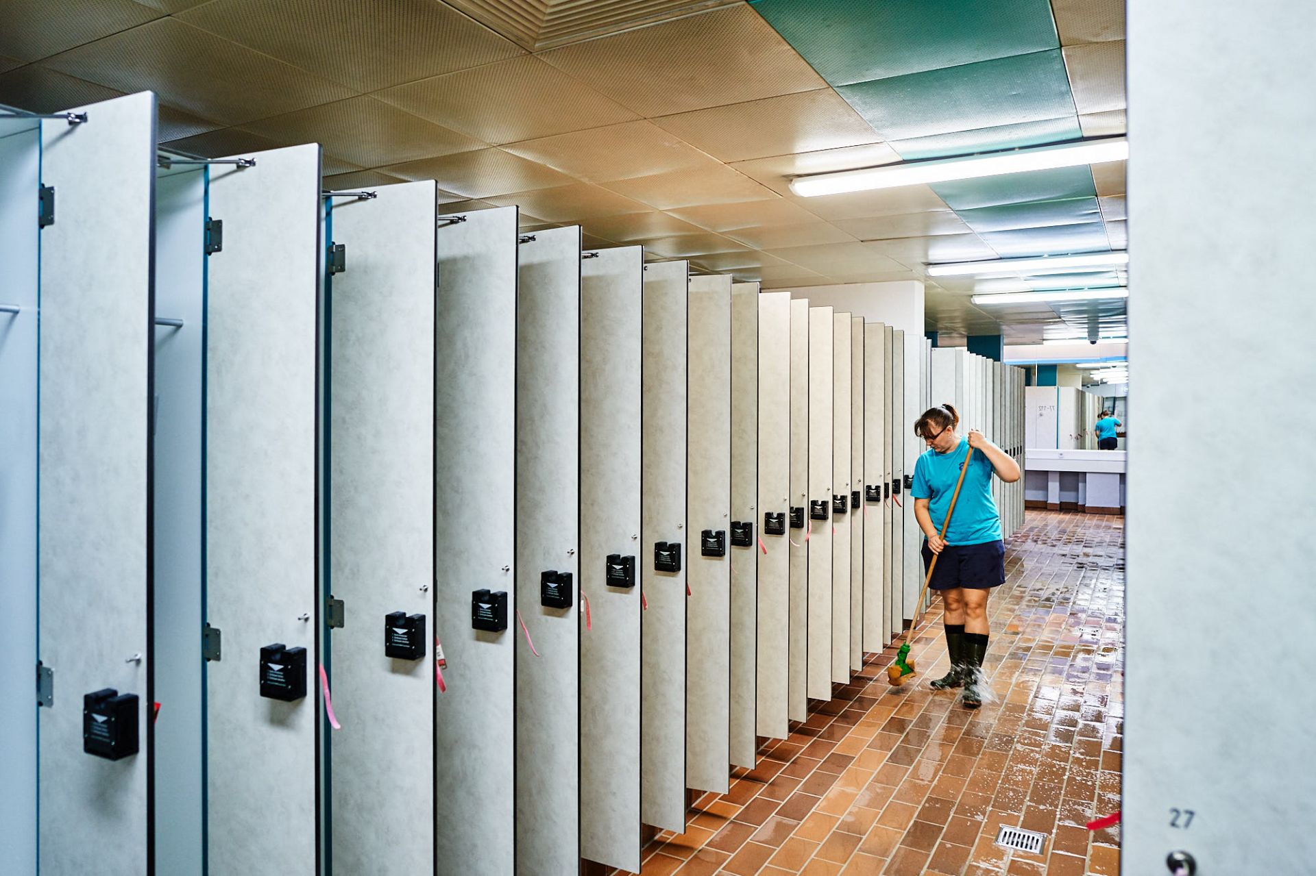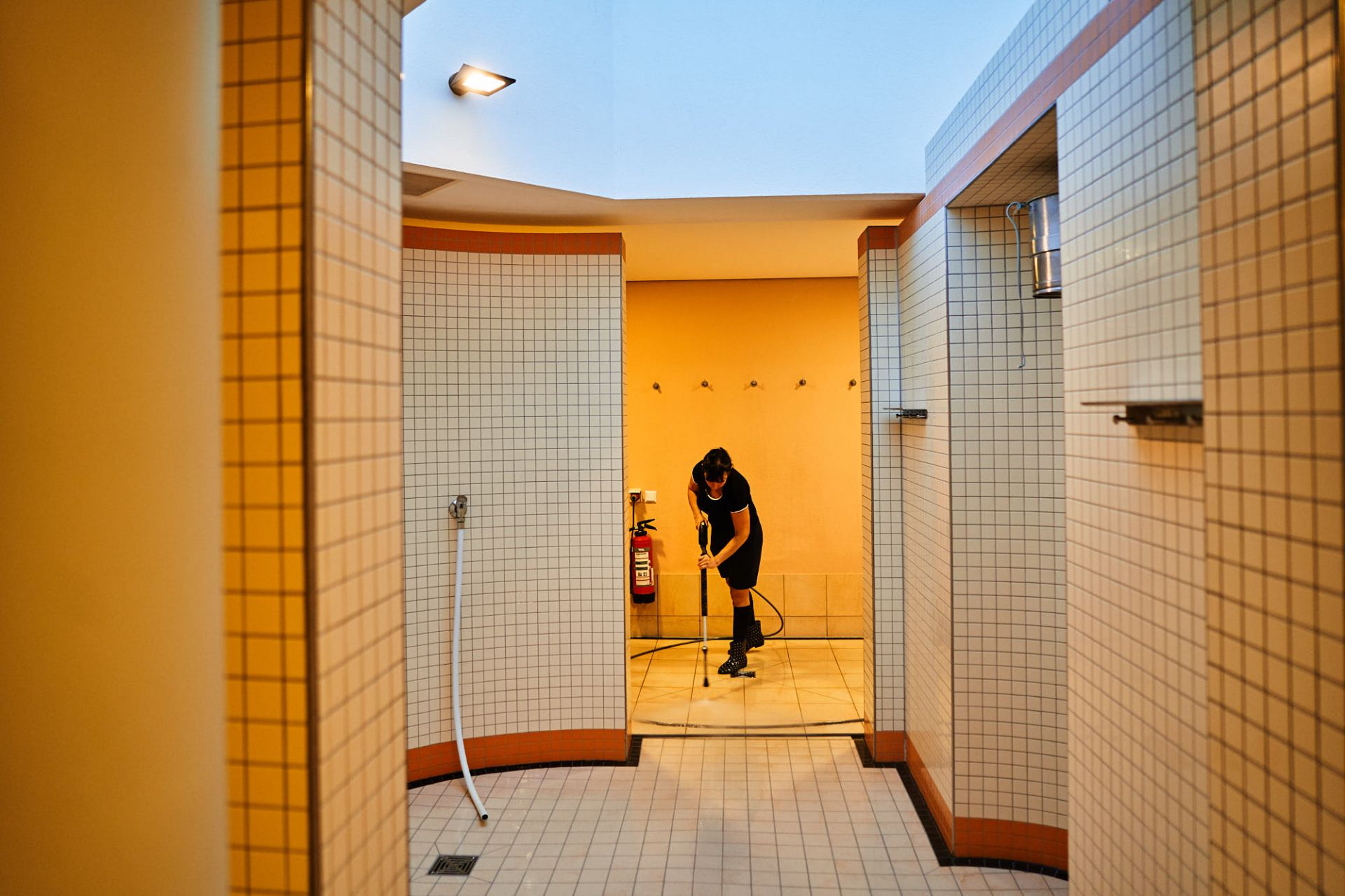 Schutzkleidung, rutschfeste Stiefel und Schutzbrillen sind nötig, wenn Schaumkanone und Hochdruckreiniger in den Duschen oder der Sauna zum Einsatz kommen. Daneben heißt es WCs einwaschen, Bodenfließen vornässen, schrubben, abspritzen und trocken mobben, Glasscheiben einsprühen und abziehen, Müll sammeln, Toiletten desinfizieren, Staub saugen und Schränke auswischen.