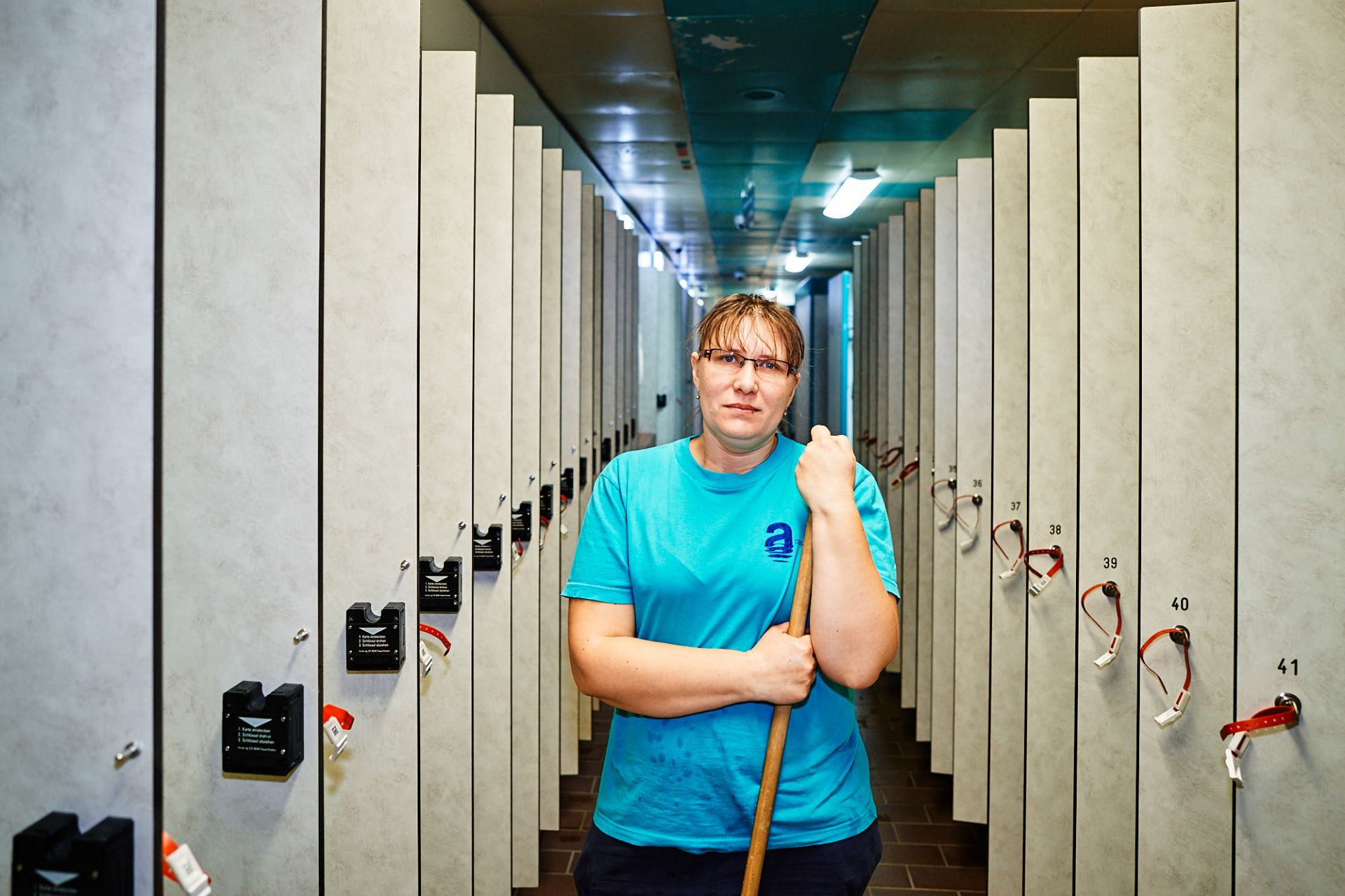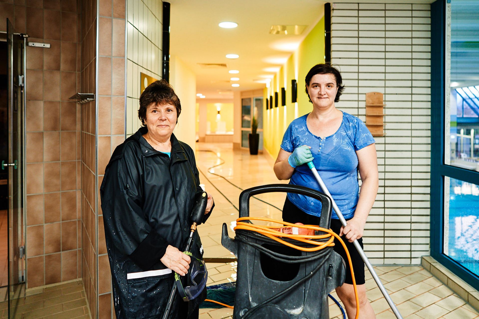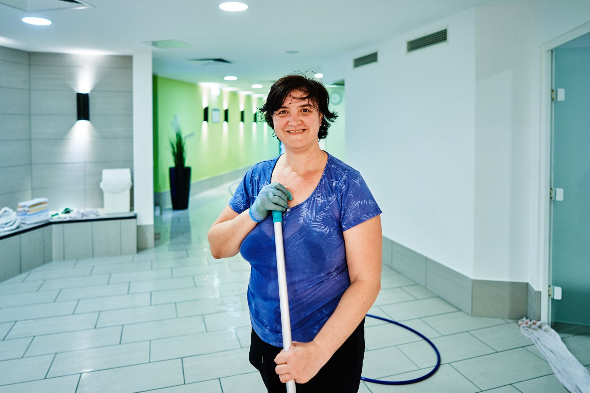 Von 6 bis ungefähr 10 Uhr sind acht bis zehn Frauen täglich damit beschäftigt, das Sole- und Freizeitbad aquasol penibel zu reinigen, bevor sich die Pforten für die Bade- und Saunagäste öffnen. „Wer hier putzen kann, kann überall putzen“, sagt Teamleiterin Marianne Filp. Die 57-Jährige muss es wissen. Seit 28 Jahren arbeitet sie für das 1986 eröffnete Bad. „Es ist eine schwere Arbeit bei hohen Temperaturen.“ Und obendrein eine genau durchdachte Arbeit, denn jede der Frauen weiß genau, was sie während der knapp vier Stunden zu tun hat. Jeder Handgriff sitzt. Sieben Tage pro Woche.