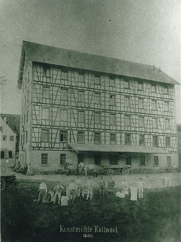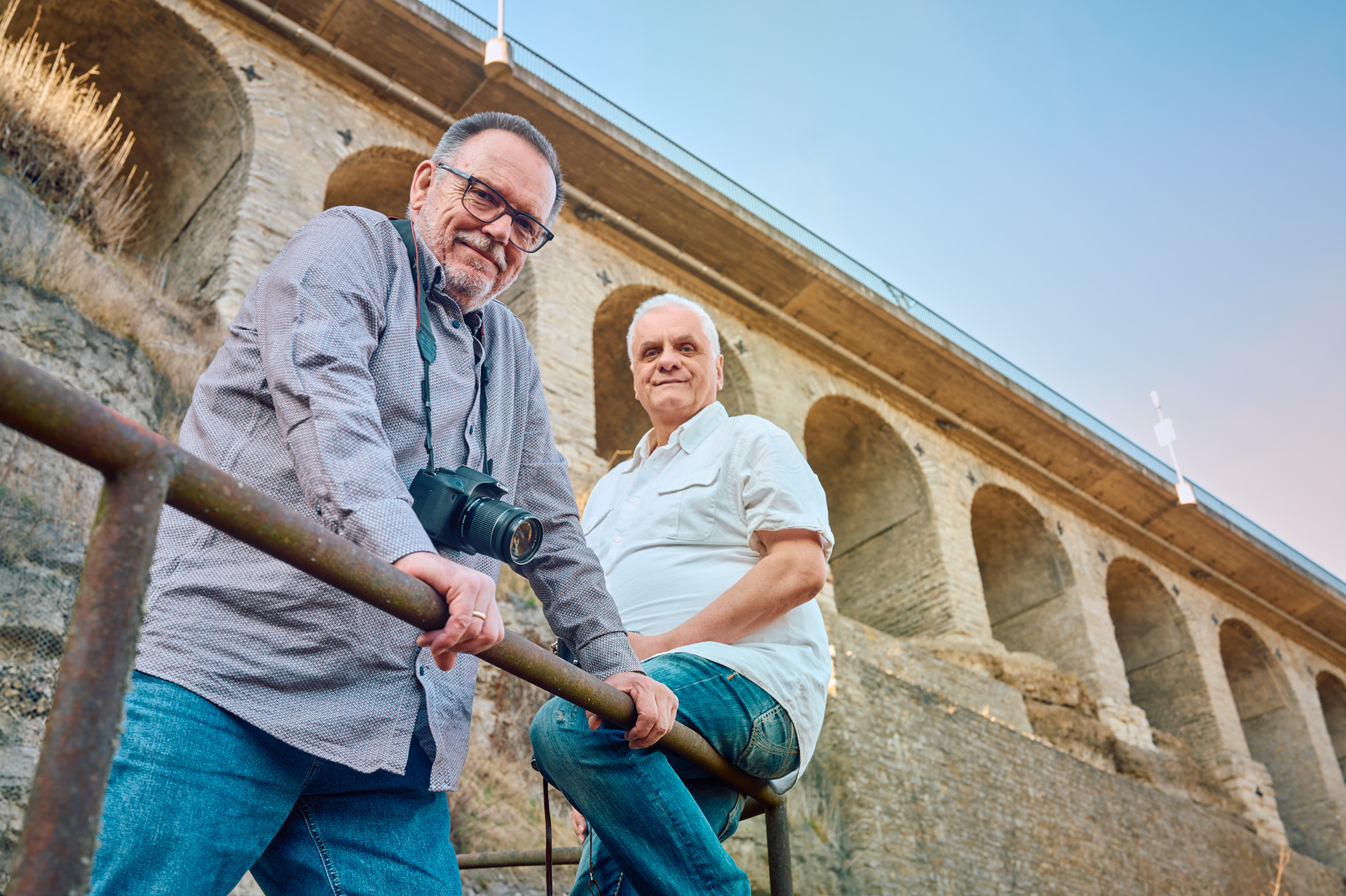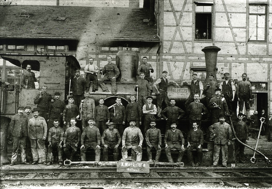 1. Bild: Der Vorstand: Heinz Zimmermann (links) und Ralf Kleinfeld | 2. Bild: Diese Aufnahme zählt zu den ältesten in der Sammlung und zeigt den Bau des Viadukts um 1875. | 3. Bild: Bitte recht ernst: Lachen auf Bildern galt früher als unschick und wurde sogar als Zeichen von Dummheit gewertet. | 4. Bild: Blick in die Au um 1910: Die Straße zum Bahnhof, gesäumt von Bäumen, ist gut erkennbar. Auch die Bahnschienen sind deutlich sichtbar. Der Bahnhof Rottweil wurde bereits 1868 eröff net. | 5. Bild: Die ehemaligen ENRW-Gebäude um 1910: Einige der abgebildeten Gebäude existieren heute nicht mehr. Auch die Brücke über den Neckar zum Bahnhof ist heute nicht mehr vorhanden. | 6. Bild: Die Vögelinsmühle im Jahr 1880: Nach einem Brand im Jahr 1906 wurde an ihrer Stelle das bisherige Verwaltungsgebäude der ENRW errichtet.