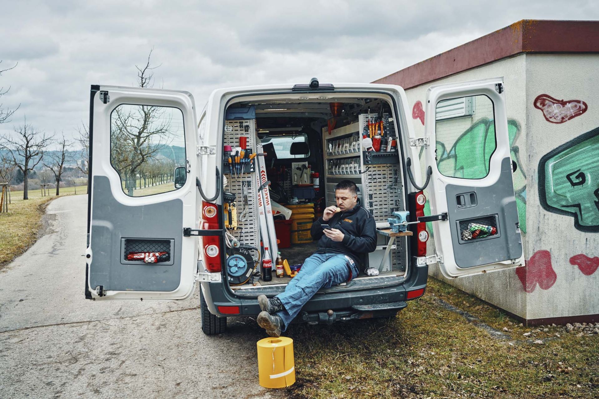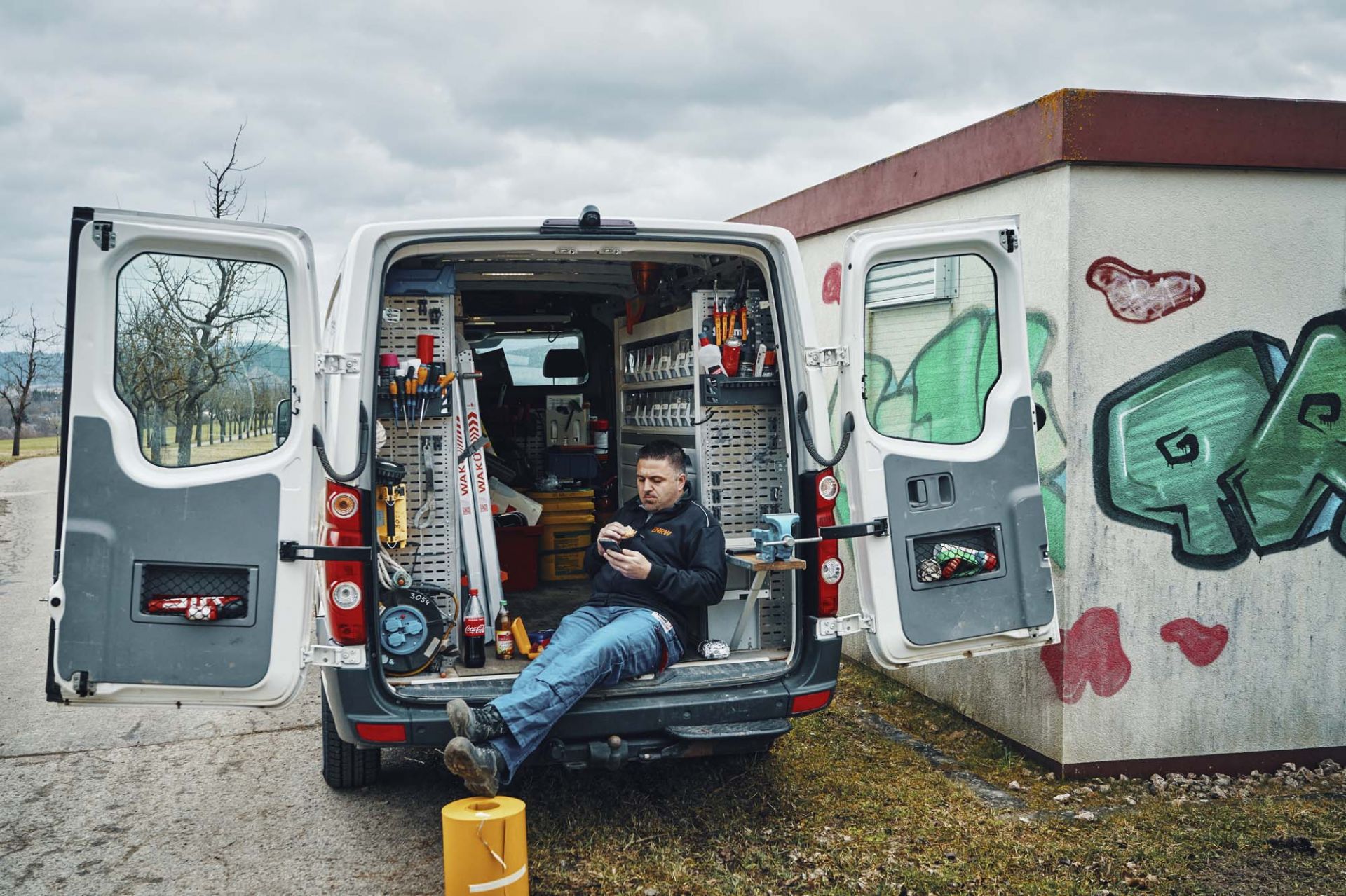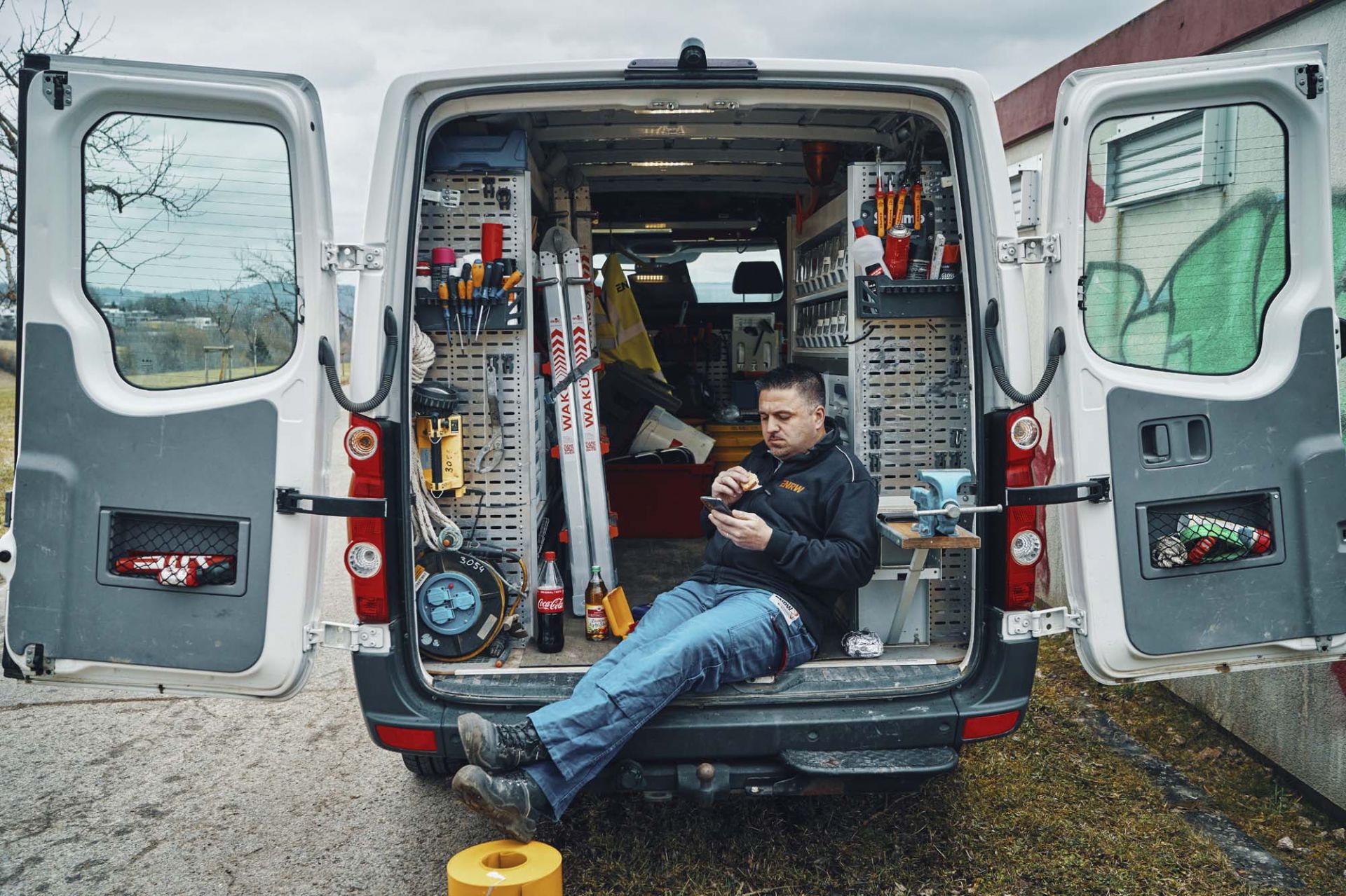 Jochen Irion macht Mittagspause bei einem sogenannten „Schalthaus“ in Rottweil. Der 39-Jährige, heute für die Einsatz- und Arbeitssteuerung sowie die Straßenbeleuchtung in Rottweil zuständig, war lange als Strom-Monteur der ENRW im Netzgebiet des regionalen Energieversorgers unterwegs, um täglich vor Ort den Weg des Stroms bis zur Steckdose zu begleiten und bei Problemen einzugreifen. Die entsprechenden Arbeitsaufträge erhielt er über die ENRW-Netzleitstelle, welche per Fernüberwachung rund um die Uhr nahezu sämtliche Strom-, Erdgas-, Trinkwasser- und Fernwärmeleitungen kontrolliert. Von morgens sieben Uhr bis mittags um 16 Uhr sind die Netz-Monteure im Einsatz. Die Pause wird da gemacht, wo es gerade passt.