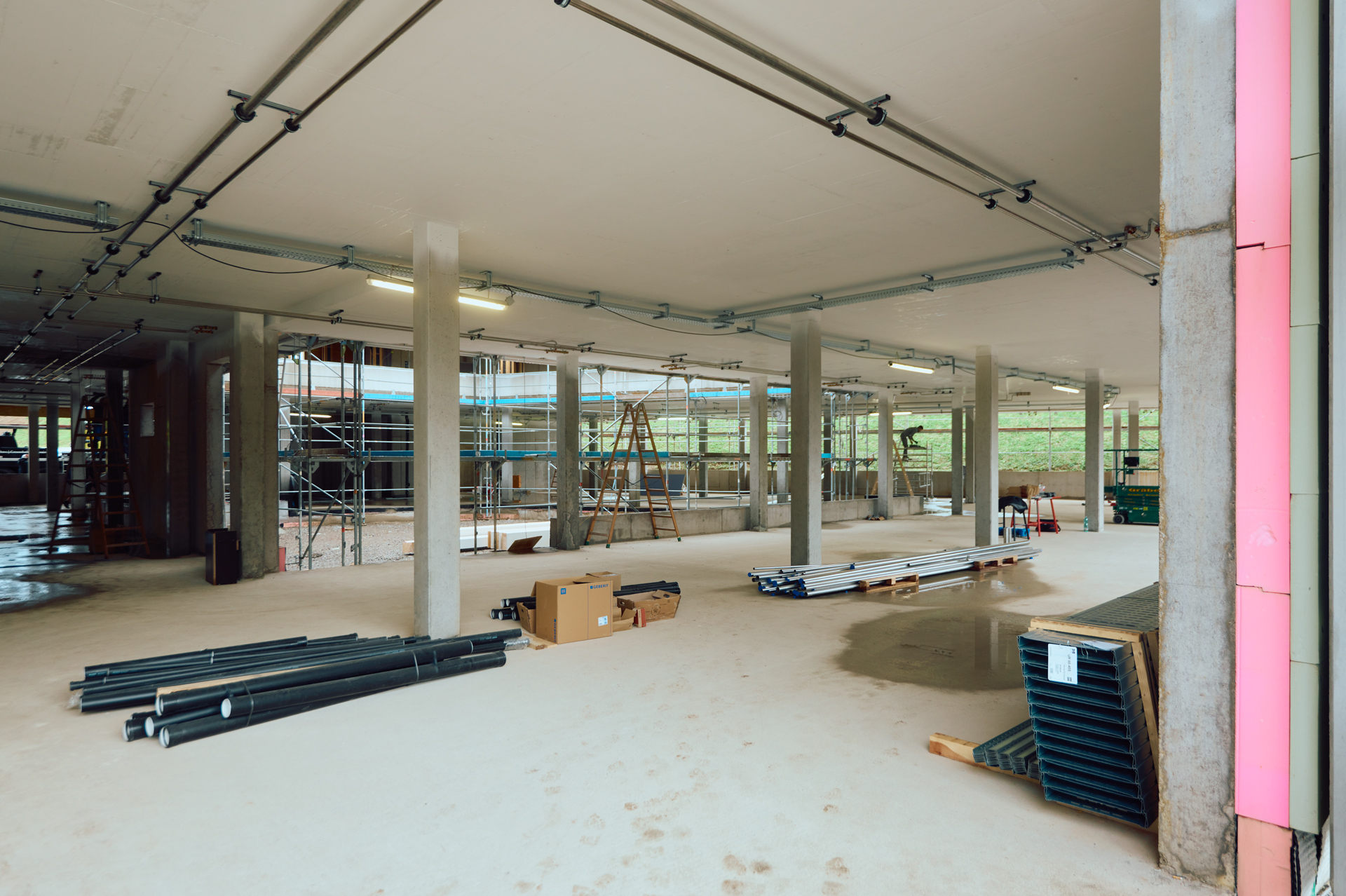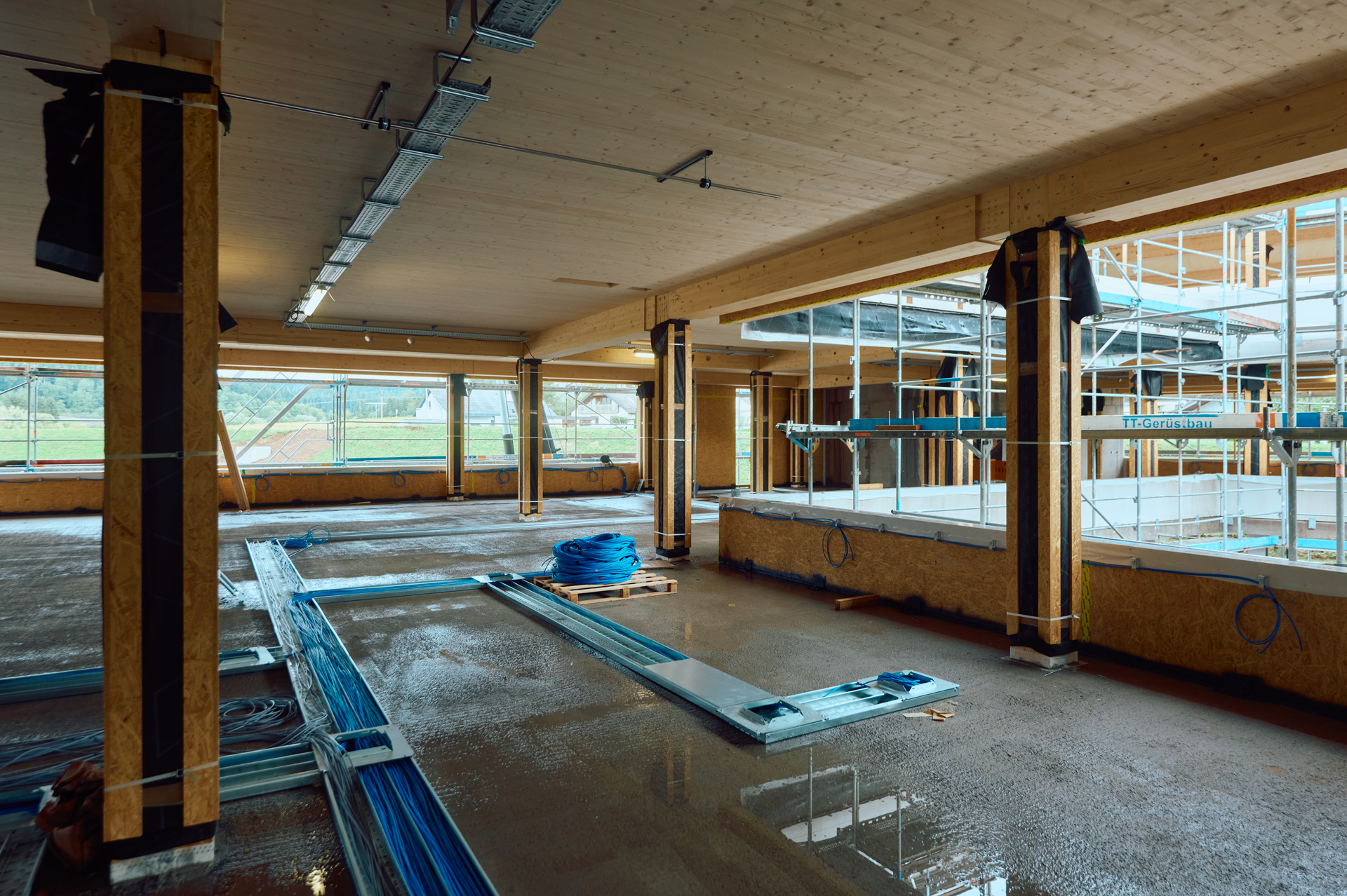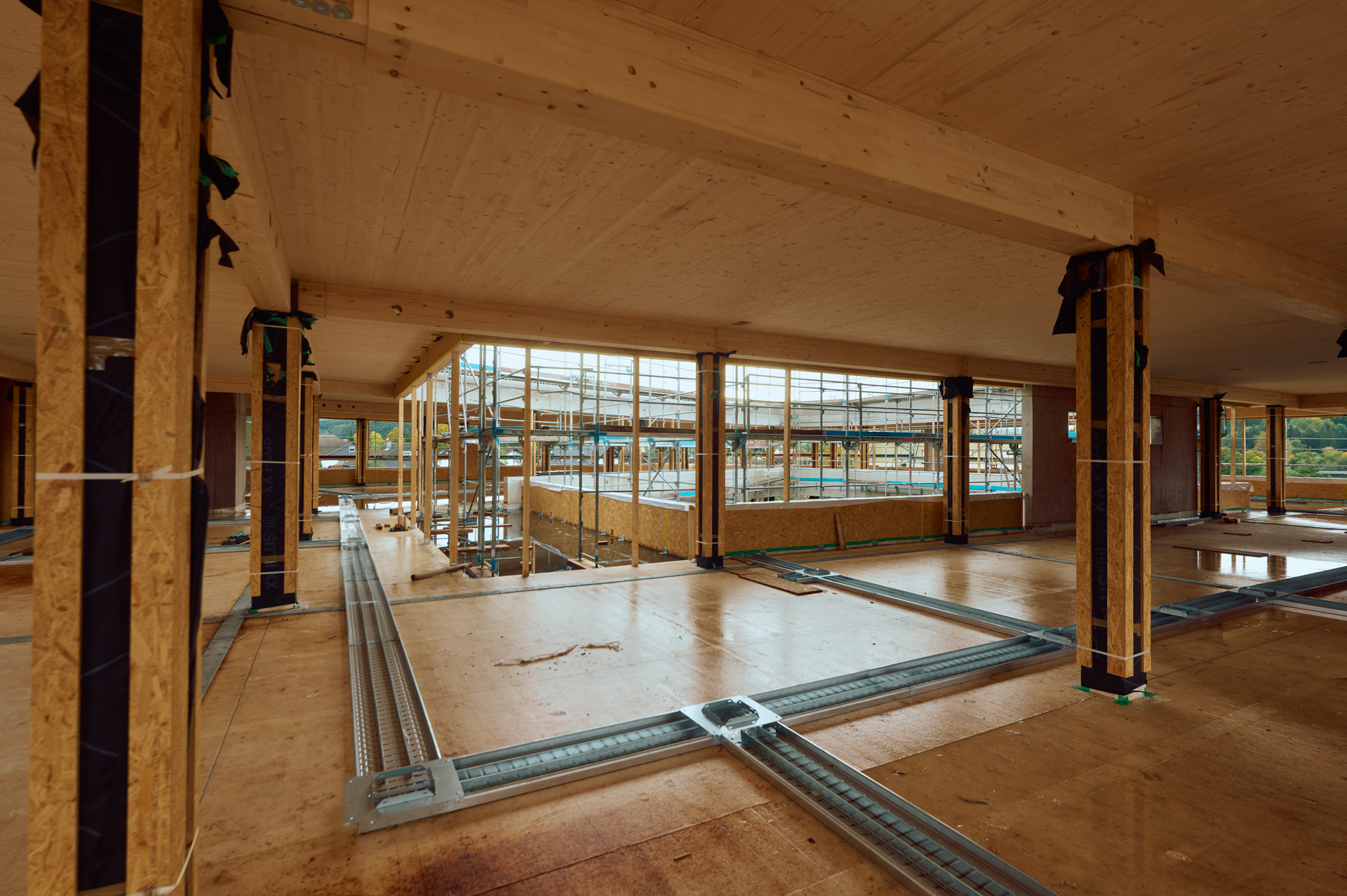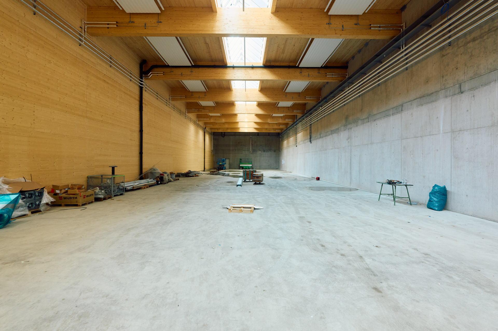 Die Holzhybridbauweise lässt sich sowohl im Lagerbereich des Technikgebäudes als auch im Verwaltungsgebäude ab dem ersten Obergeschoss sehr gut erkennen. Bei dieser Bauweise werden sowohl Holz als auch Beton in ihren Stärken kombiniert und ermöglichen dadurch eine nachhaltige sowie möglichst effiziente Bauweise.