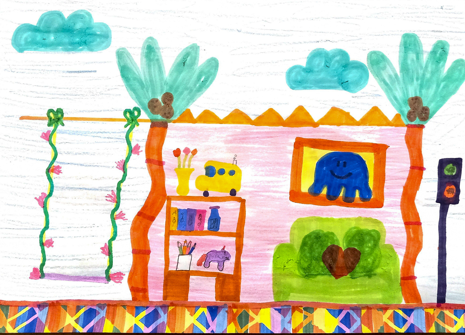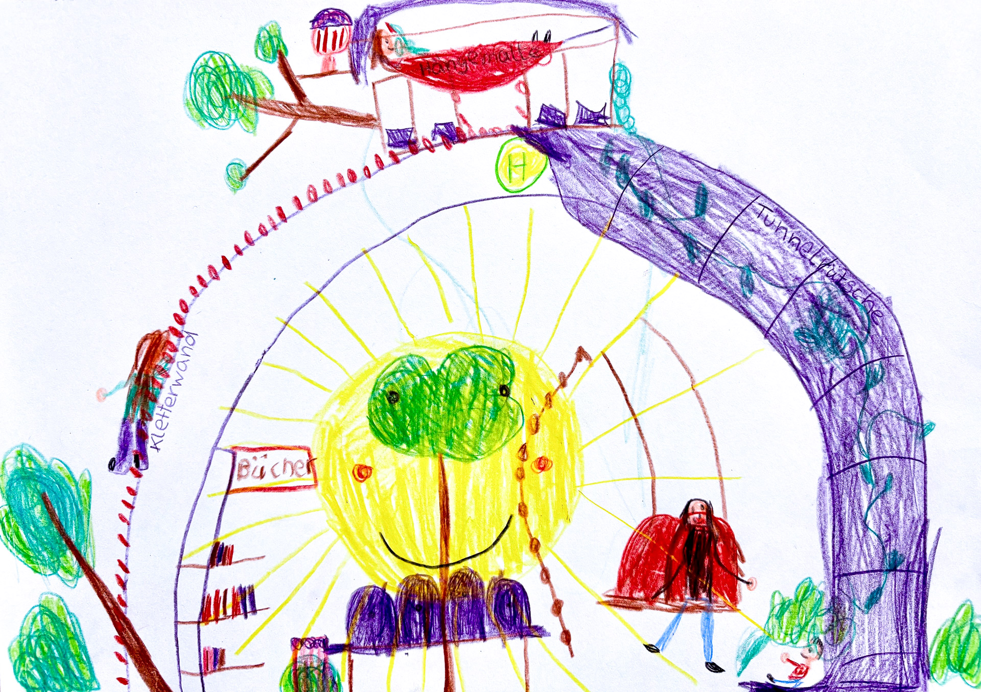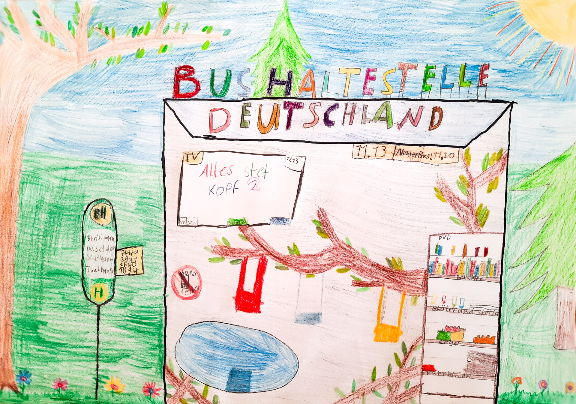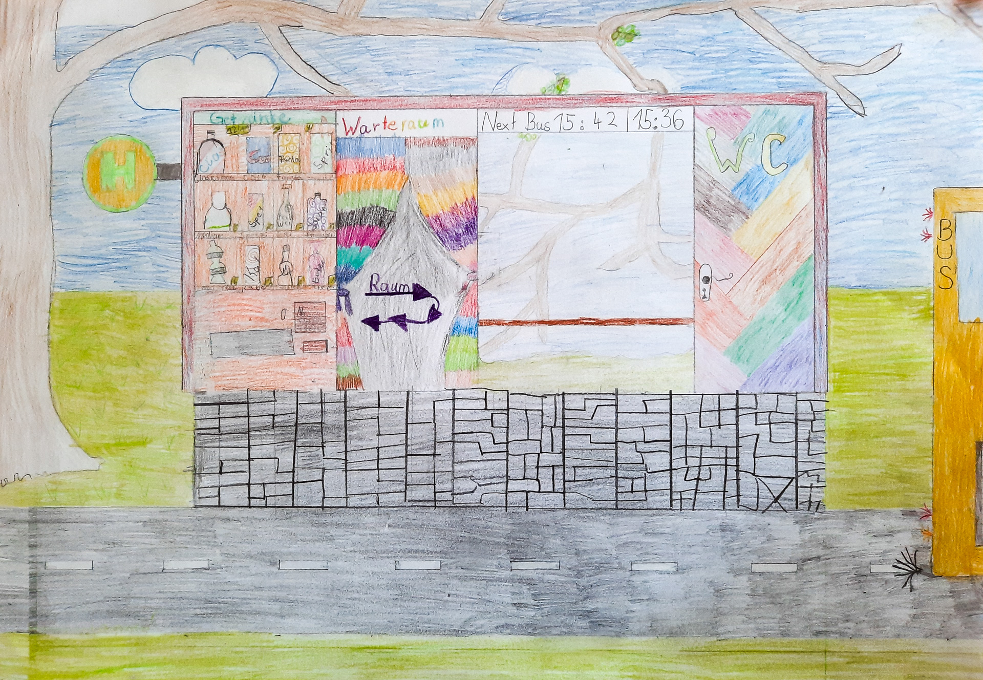 Mit Bücherregalen, Sofas, Snackautomaten, Lademöglichkeiten fürs Smartphone und vor allem farbenfroh: So gestalten die Kinder die Bushaltestelle der Zukunft.