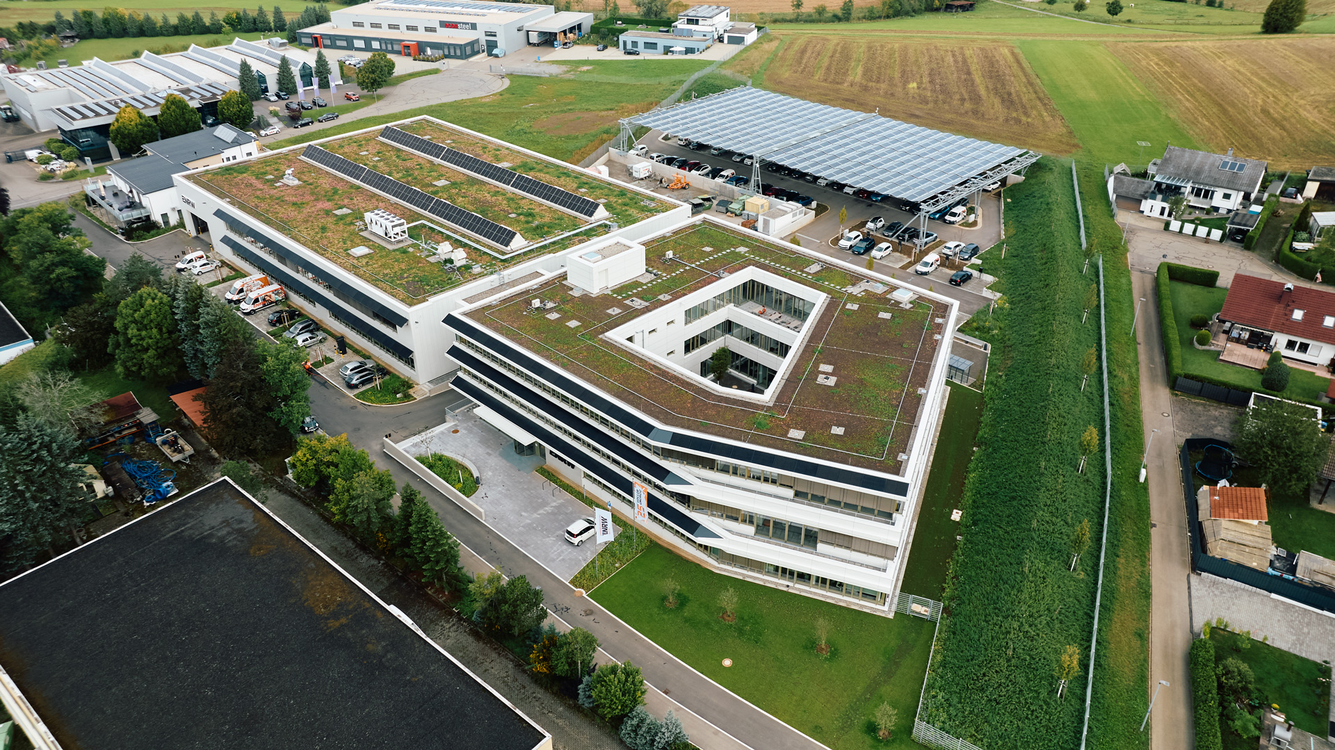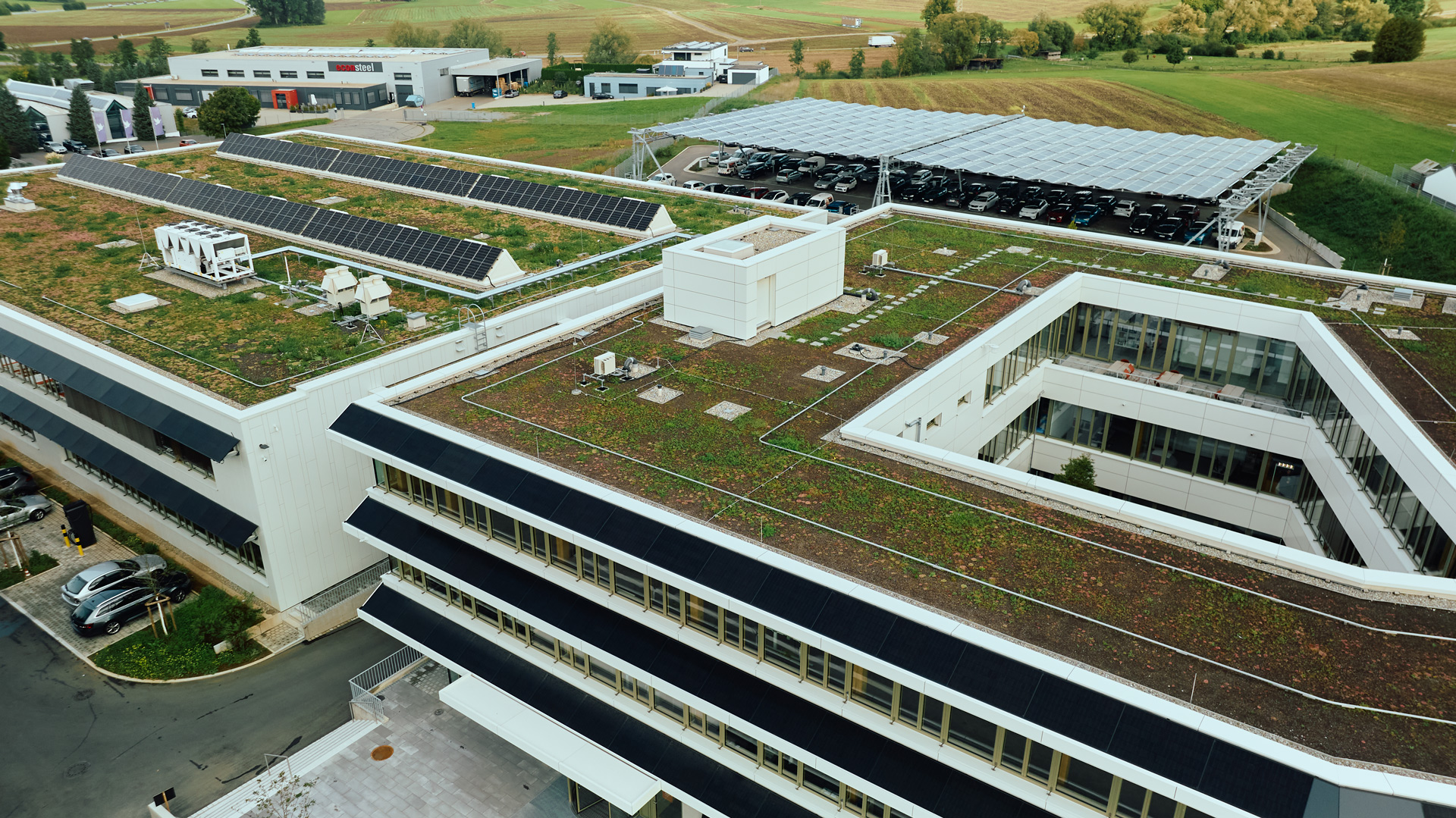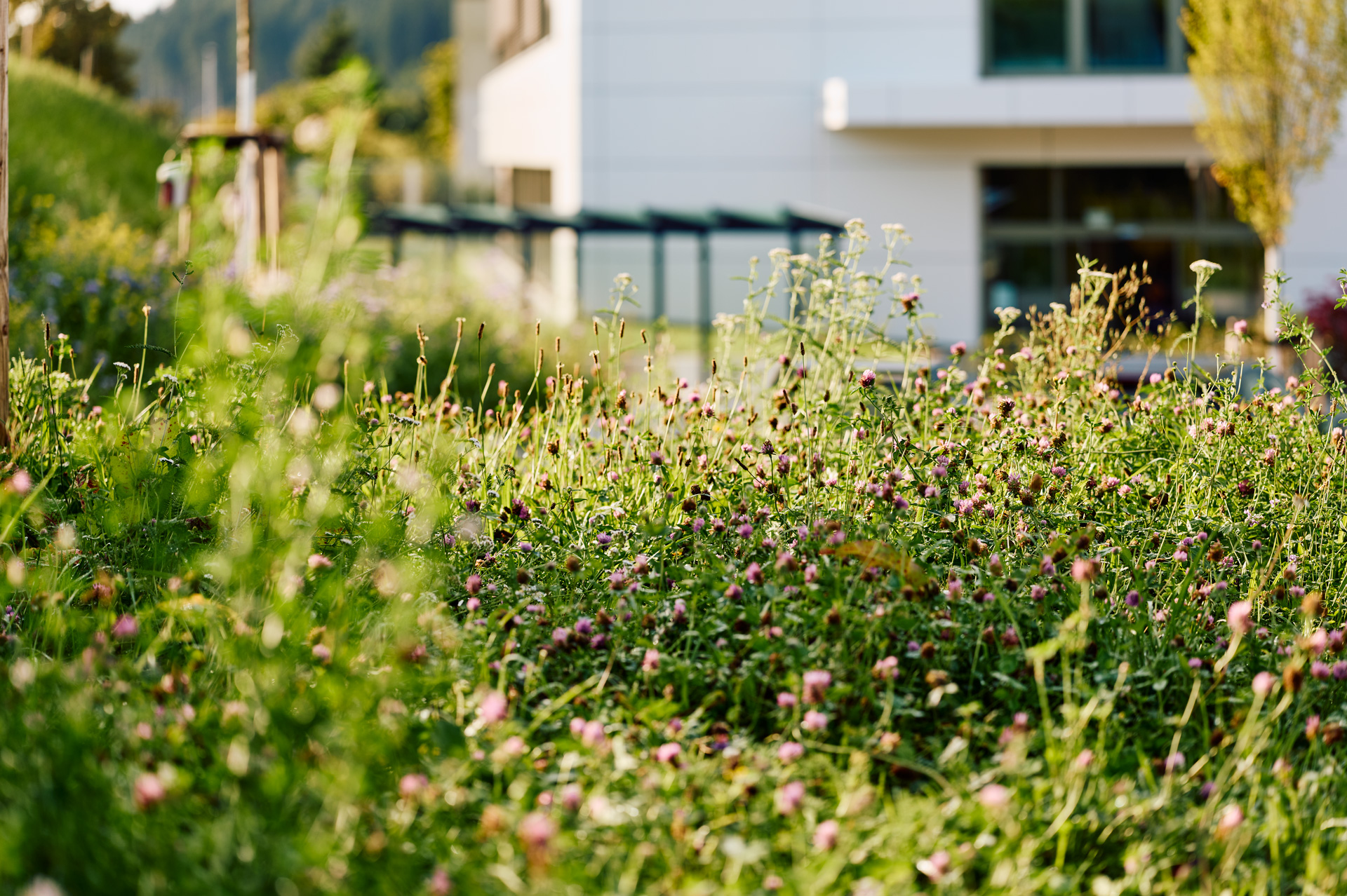Auch oberhalb der Grundfläche wurde reichlich Grün angelegt. Auf knapp 4.000 m² haben die Gebäudedächer eine Dachbegrünung erhalten bestehend aus Kies, Vegetationssubstrat und einer Bepflanzung mit Flachballenpflanzen. Diese haben den Vorteil, dass sie in die Breite wachsen und eignen sich somit ideal für Flachdächer.