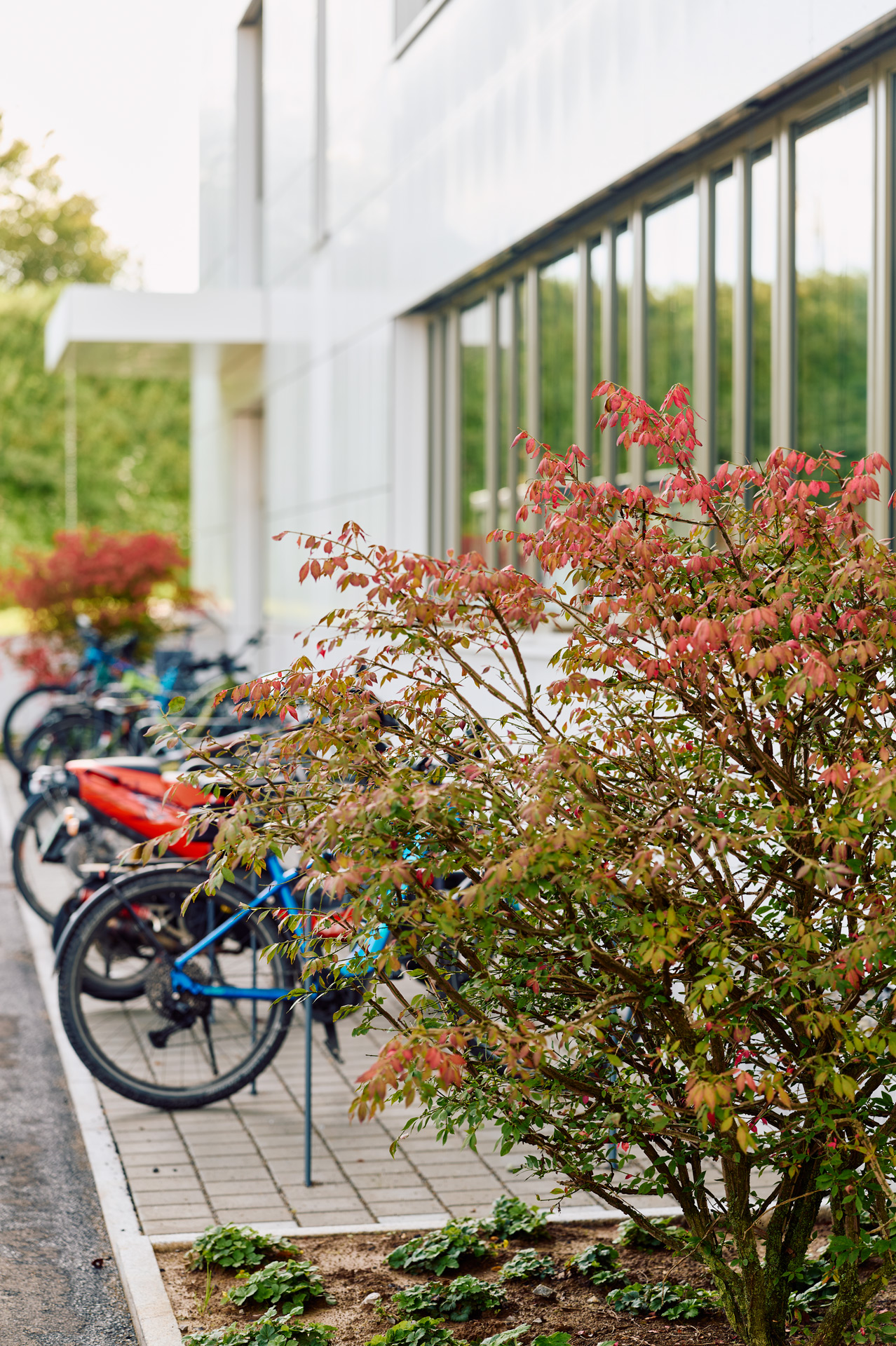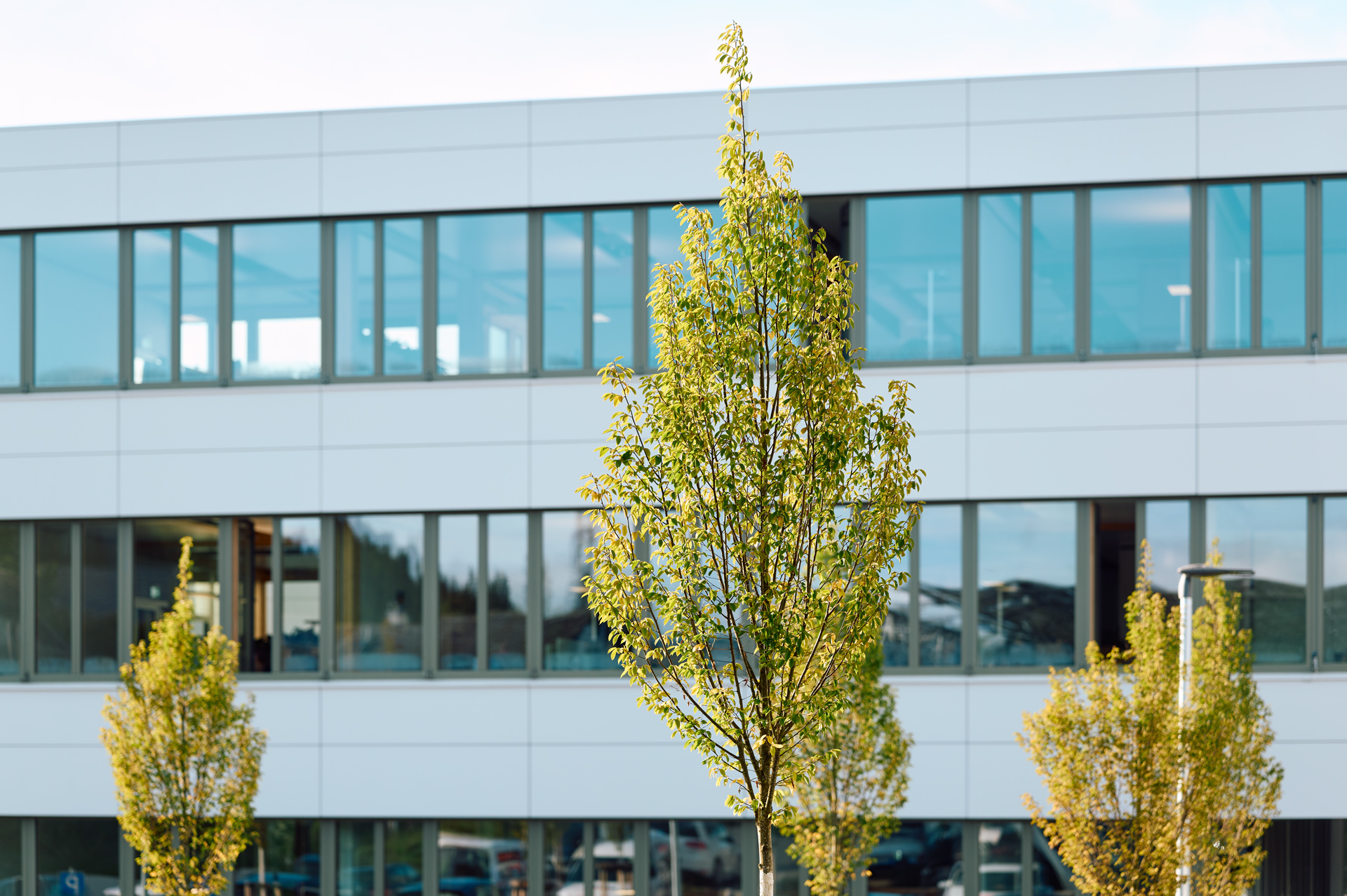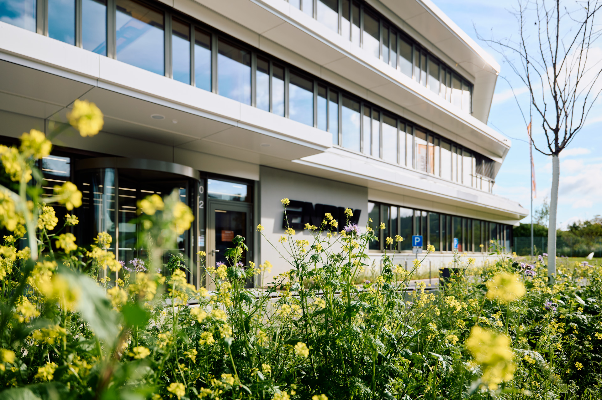 Auch die Randflächen an Parkplatz und rund um das Gebäude wurden vielseitig begrünt. Vor dem Haupteingang zum Kundenzentrum wurden rund 600 Stauden gepflanzt, darunter Storchschnabel, reichblühendes Fettblatt und Amethyst-Schwingel. Zierapfel, Felsenbirne und Zierkirsche wachsen entlang der Fassade, auf den Freiflächen wurden Rasen gesät und verschiedene Bodendecker gesetzt. Hier und da werden im Frühjahr Tulpen und Narzissen das Gelände verschönern. Insgesamt wurden auf diesen Außenflächen fast 4.000 Bäume, Sträucher, Stauden und Zwiebelpflanzen gepflanzt.