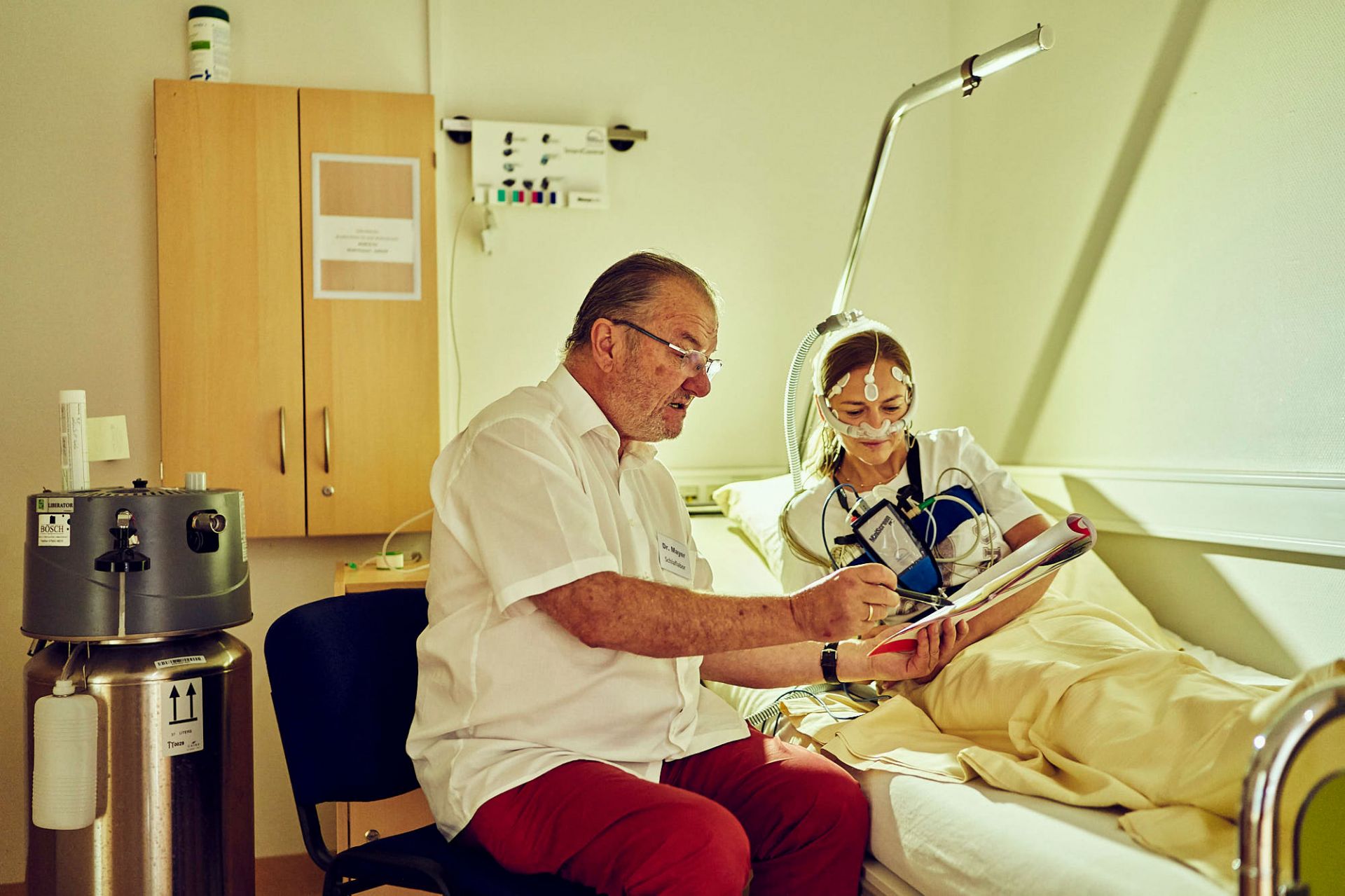 Ab 19.30 Uhr beginnen die Vorbereitungen für die Nacht. Die Patienten in den zwölf Zimmern werden verkabelt und somit an die Überwachungsgeräte angeschlossen. Obwohl jede Räumlichkeit mit Dusche, WC und einem Fernseher ausgestattet ist, schläft nicht jeder Übernachtungsgast so gut wie in einem Hotel: „Die Bandbreite ist groß. Manche schlafen sehr gut, andere weniger und ganz selten behelfen wir uns mit einem leichten Schlafmittel.“ Abbrüche gebe es so gut wie nie, „da ist der Leidensdruck zu hoch.“